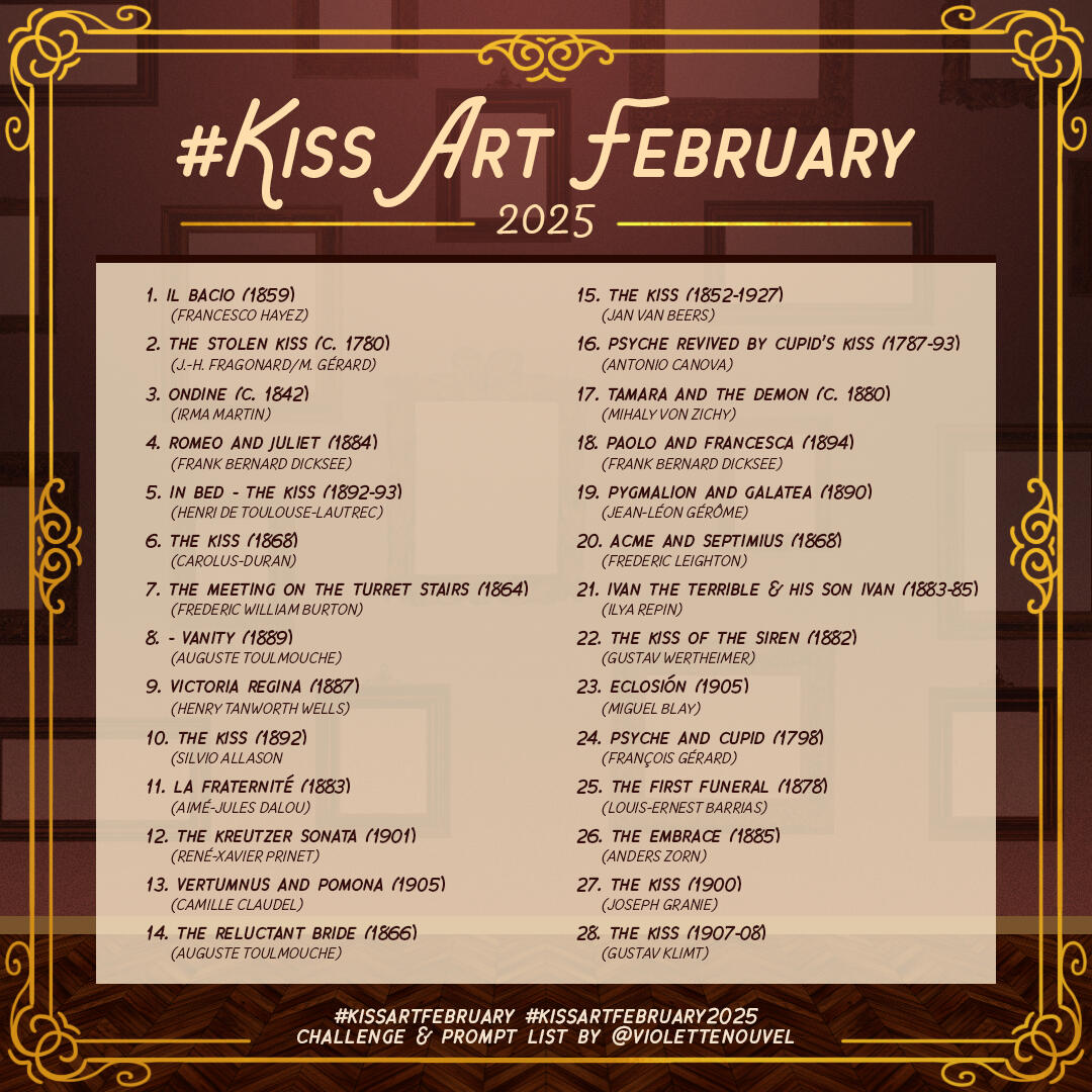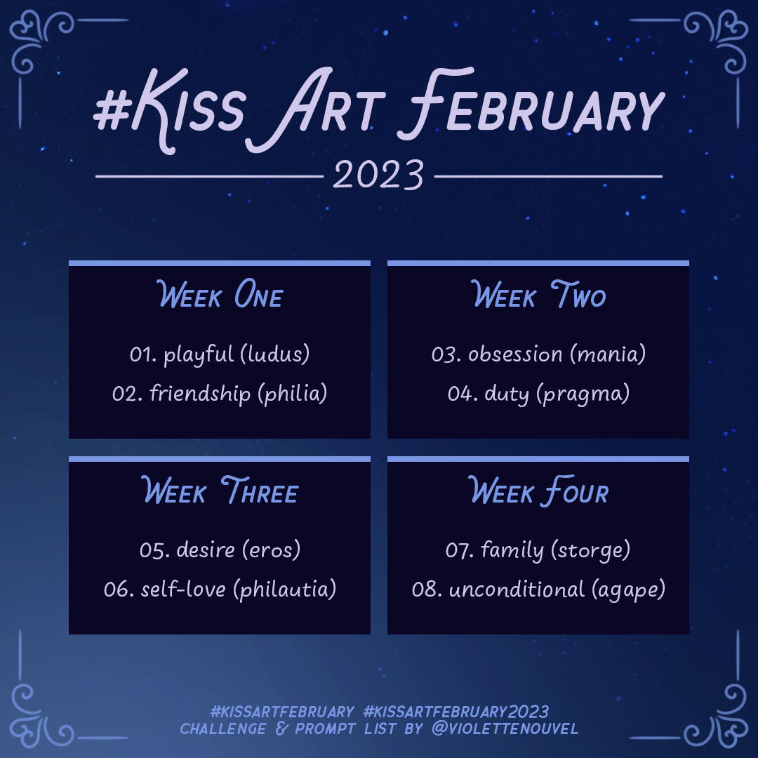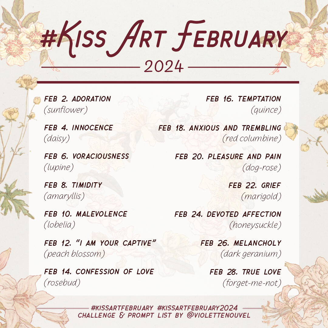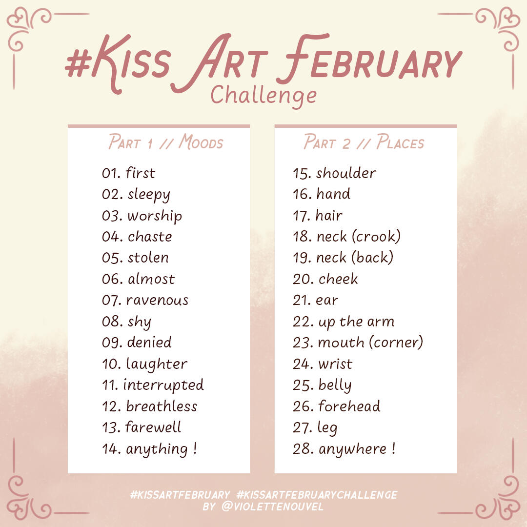 Once upon a time, there was an artist who wasn't very good at drawing kisses and wanted to change that. To motivate themselves, they invented an Inktober-style challenge, which they crudely named Kiss Art February.